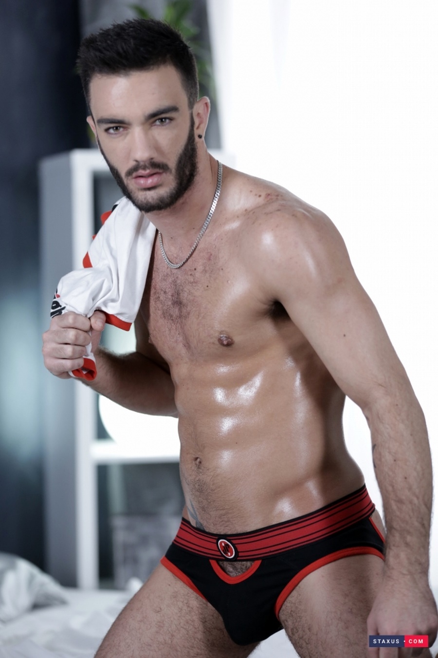 Staxus has today released the fourth scene from their mini-series “Use Me!” in which they have paired of bearded muscle hunk Alejandro Alvarez and cute Czech boy Edward Fox. The latter one is the pizza delivery boy (how original) who brings Alejandro his pizza. Despite the trite plot, this scene is amazingly hot.