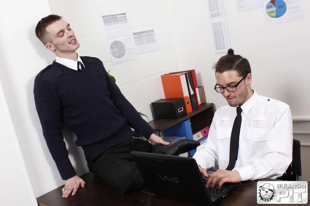 In this new scene from Bulldog Pit called “Officer Initiation” we see rookie Johny Cruz working late in the office when tall and handsome AJ Alexander comes in saying they should head off, leaving the paperwork for later.