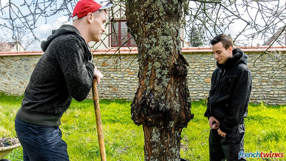 The guys from French Twinks have released a very hot outdoor scene starring Chris Loan and Baptiste Garcia. In between two shoots, the guys decide to rake some leaves in the garden of the French Twinks’ house. Baptiste takes a break to have a smoke and take a piss. Chris is turned on by the sight of his boyfriend peeing against a tree.