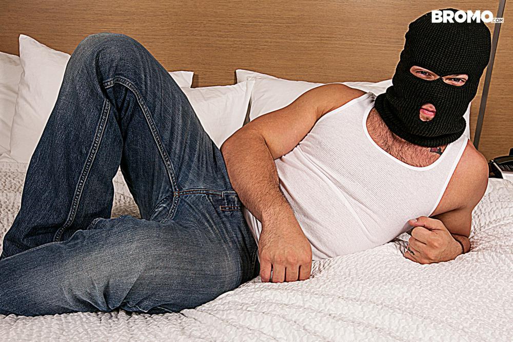In the second scene from “He Likes it Rough and Raw” from bareback site Bromo.com another masked guy is ready to plow some ass. Buck Richards is buck-naked and handcuffed on the bed when Aspen walks in donning a mask.