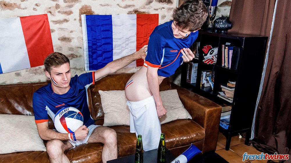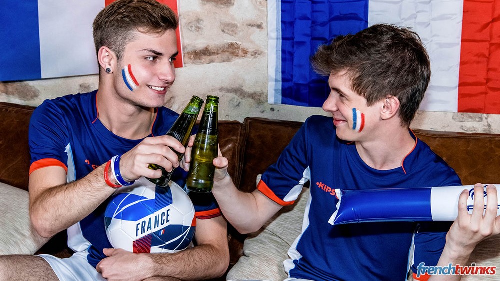 Dressed in the colors of their favorite team Robin Castel and Abel Lacourt from French Twinks support the French team during the final of the European soccer tournament. While Robin is a passionate supporter, Abel seems to watch the game without interest and has other things in mind.