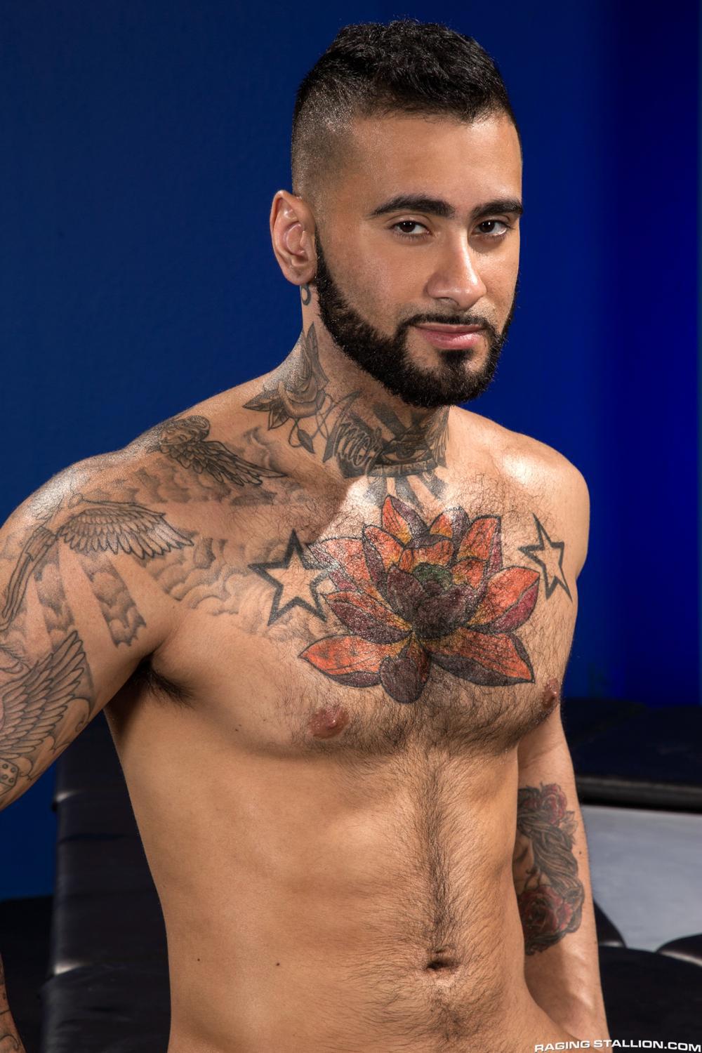 Raging Stallion has released the third scene from “Bout To Bust“. Tall, tattooed Rikk York‘s hot cock rubs against Hugo Diaz‘s furry stomach as they exchange kisses. Hugo can’t resist getting a taste of Rikk’s meat. Rikk helps out with lubrication by letting a thick strand of saliva drip into Hugo’s mouth. Signaling that Hugo’s more than turned on, precum oozes from his uncut cock.
