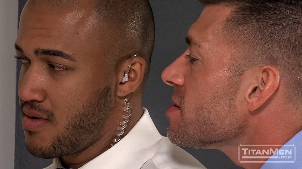 The guys from Titan Men have released the third scene from their “Cauke For Free” series. Special agent Bo Hunter (played by Jason Vario) eyes the action in the hotel suite during election night. He’s approached from behind by lobbyist Bruce Beckham, who whispers into his ear: “You like watching?”