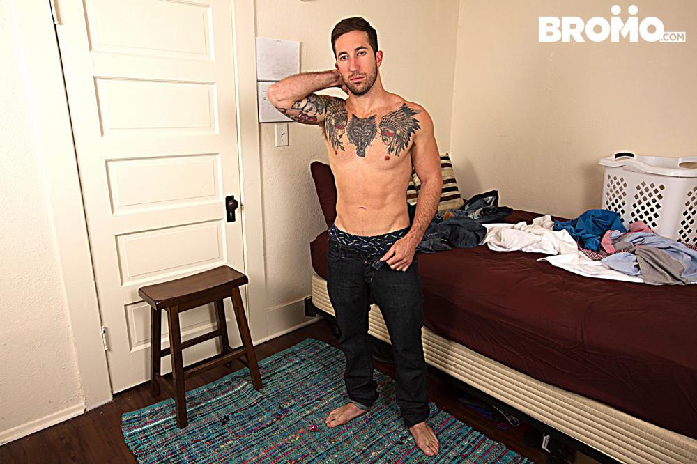 Bareback studio Bromo has today released the fourth scene from their mini-series “The Intruder” Muscle hunk Leon Lewis must be asking “Where did my underwear go?”, he only dropped them off a second ago. He soon gets his answer when he opens the closet to find a big piece of man meat in the form of Brad Powers‘ cock.