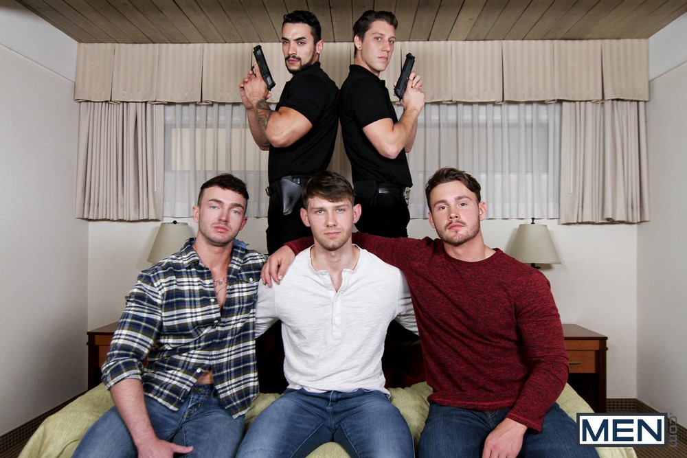 Paul Canon and Arad Winwin are hot on the tail of the three outlawed hunks… but it could do them better to know what the guys on the run actually look like. Arad is tricked by Jacob Peterson, who gets down on his knees and sucks his beautiful cock. Paul Canon enters the scene and the seduction of the officers continues. The men worship each other’s bodies, and it only gets hotter when the clueless cops invite the rest of the thieves (Trevor Long and Jake Ashford) to join them in a jizz orgy.