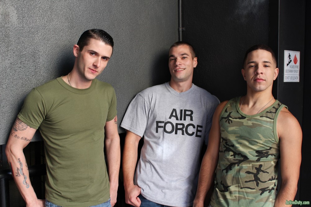 Active Duty has veteran Princeton Price paired up with two fresh rookie recruits; Phillip Fox and Diego. This bareback threesome is incredibly hot! When Claude lets these three get down to business, Princeton doesn’t hesitate to plant his luscious lips on Diego’s hard cock and allow Phillip to suck his stiff dong.