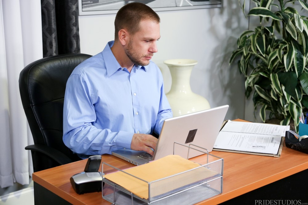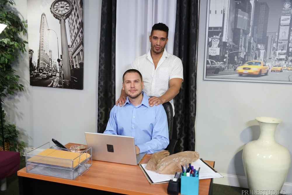 Pride Studios has brought together Hans Berlin and Trey Turner for some hot office flip-fuck action. “Lunch Break” starts with Hans having a very heated conversation with a client on the phone which is upsetting him. As the conversation escalates, we can tell that Hans is beyond frustrated and having a bad day. As he hangs up the phone there is a knock on his office door.