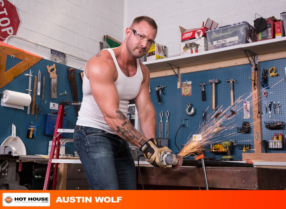 Hot House has today released the third scene from their “Dirty Work” movie. Derek Bolt is making precise measurements in the workshop when sparks fly between him and Austin Wolf. Austin notices the look on Derek’s face and invites him over. As they make out, Austin guides Derek’s hands to his bulge, and Derek pulls Austin’s cock out of his jeans. Sinking to his knees, Derek swallows Austin’s cock as Austin plays with his nipples.