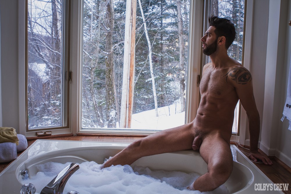 Minutes pass and the heat in the rooms rises, the air thickens and our sex-starved duo can’t get enough of each other. Colby then straddles both sides of the tub while Mick sits in the water so his face is eye-to-eye with Colby’s hairy round butthole. Mick rims away! And, Colby’s moaning only intensifies. Once Colby’s hole is richly lubed with Mick’s saliva, the tall Mediterranean-looking stud gets up and shoves his stiff prick into Colby’s hungry crack.