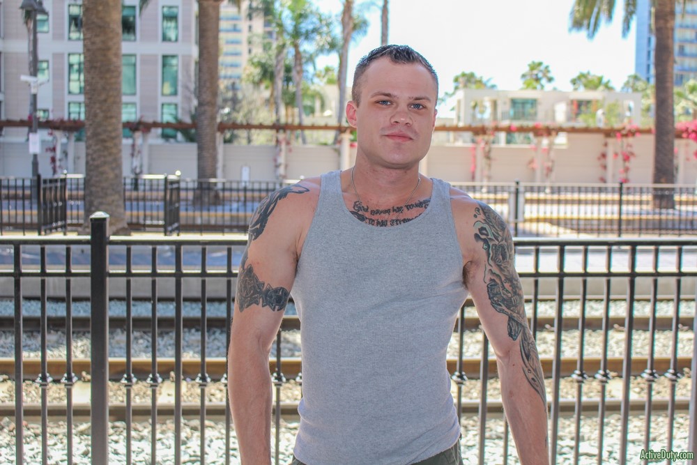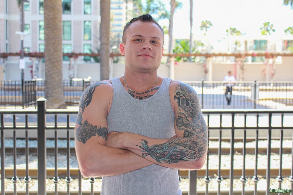 We have an inked bad boy entering the Active Duty ranks today. He’s fresh and ready to break in and see how far he can climb. Cody Smith is 24 standing at 5 foot 10 and weighing in at a strong 160lbs. Cody is either at the gym working on his fit hairy body or he’s hanging out at the local Tattoo shop acquiring more ink. You’ve probably seen him before at Bromo.
