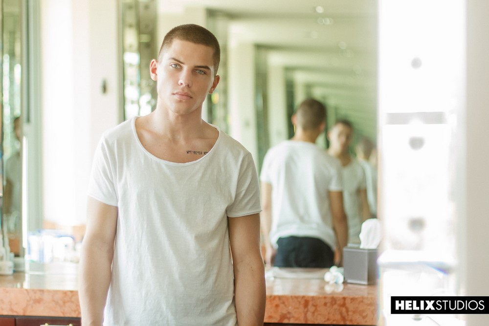 Damn! The guys from Helix Studios have found themselves another hot and horny young hunk. Ezra Michaels is a rare find, the kind of guy you’d see in a glossy fashion magazine and fantasize about fucking the shit out of you. In a master suite’s plush bathroom, Ezra strips down and seductively shows off his chiseled bone structure and tight, tanned body before hopping in the shower.