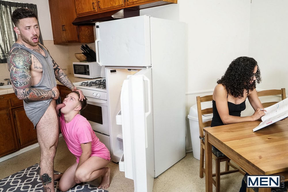 The blond twink has been paired up with inked stud Jordan Levine. Timothy sucks Jordan’s big cock and gets his ass rimmed before Jordan teaches Timothy’s hole how to take a fat cock. Timothy ends up covered in spunk.