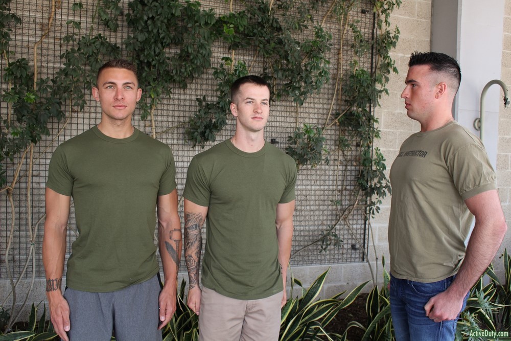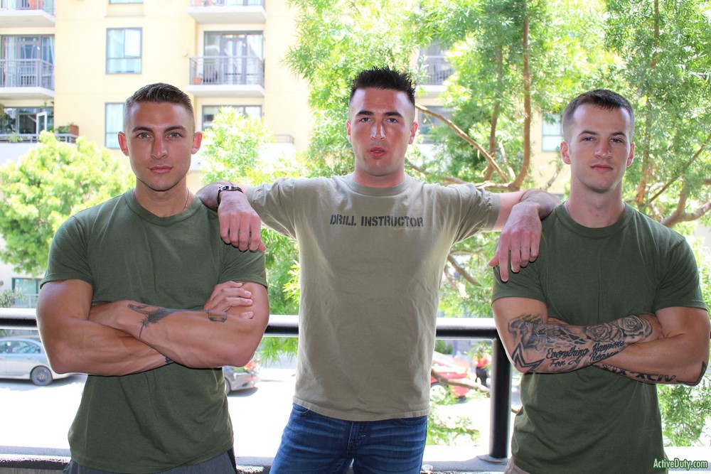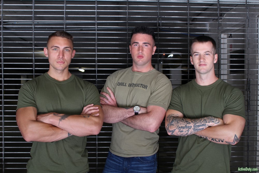 Today’s release from Active Duty is a bareback threesome starring horny young recruits Quentin Gainz, Ripley Grey and Jay Ice. Sexy buddies Ripley and Quentin are hanging out in the armory chatting about how they are hoping today will be a relaxing day but in the background you can hear Jay coming down the hall.