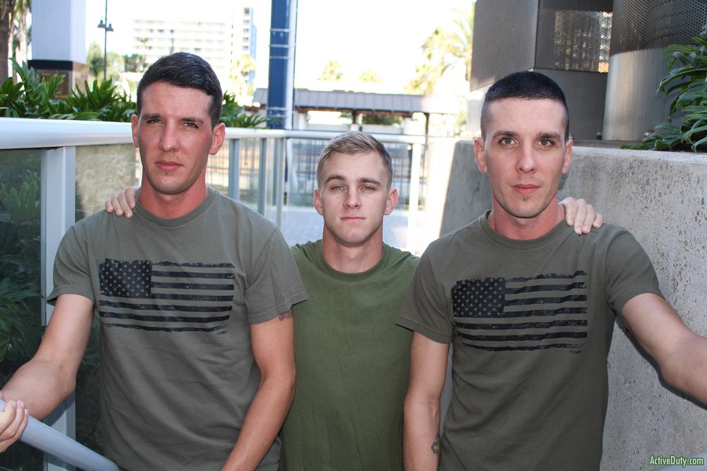 Twin brothers Michael Stax and Jacob Stax fuck Ryan Jordan at Active Duty