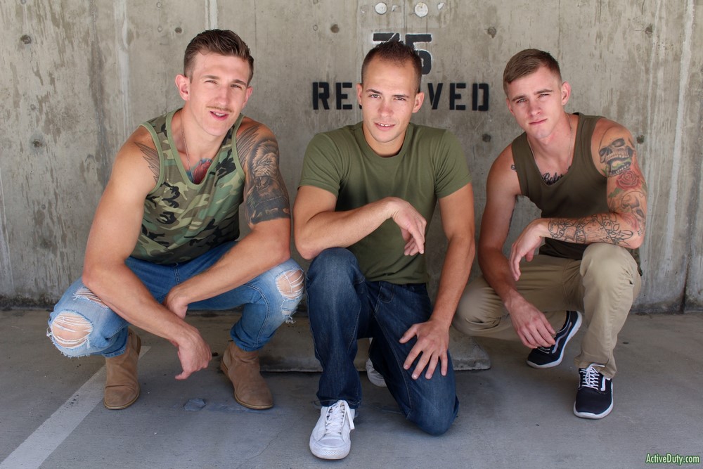 Max wanted to stop by and say hi before he takes his flight back home and he needed some cock for the road, so he dives right in and starts blowing both of the sexy soldiers. His mouth moves from one hard cock to another as he worships Ryan and Richard’s throbbing dicks.
