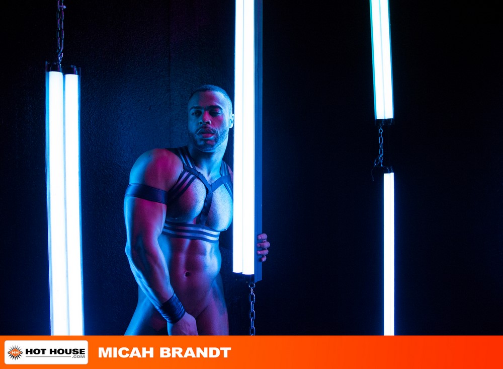 Hot House has released the fourth and final scene from their “Get Lit” movie. Director Nick Foxx has paired up masculine studs Austin Wolf, Micah Brandt and Ryan Rose for a hot sling fuck! Micah is hanging out in the sling waiting for someone to come along and make some action happen. Ryan enters through the door and the two muscle studs start making out.