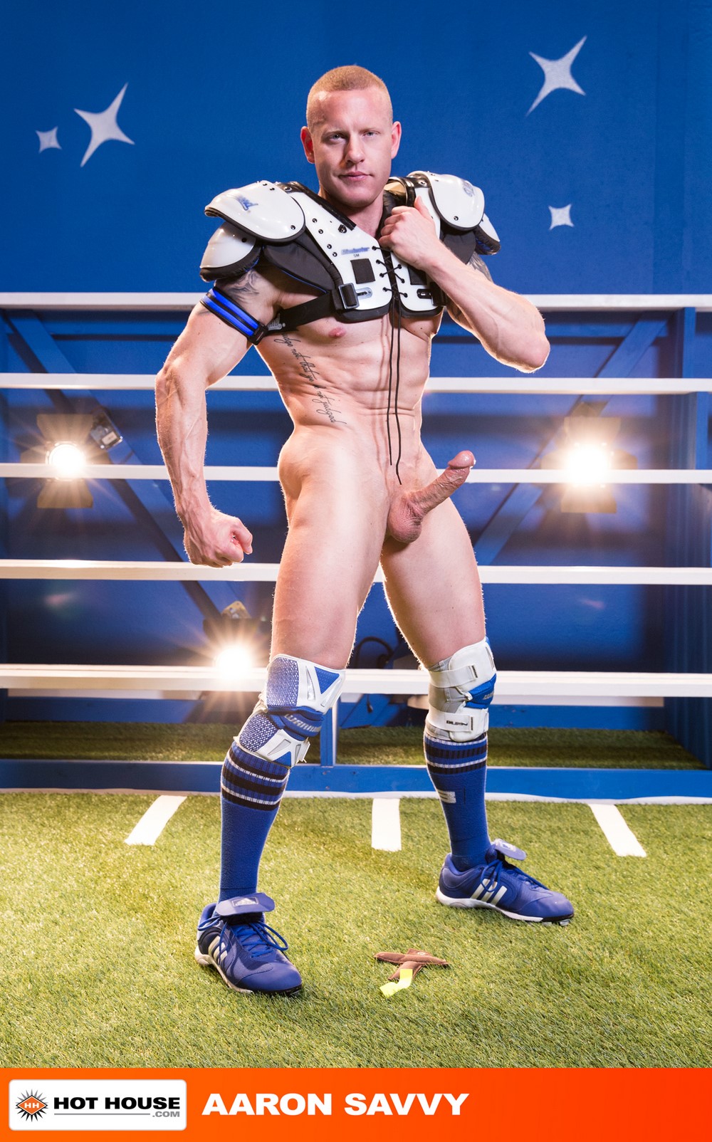 With his dick hard and his mouth hungry, Aaron stands Johnny up to get a face fucking of his own. The faster Johnny plows his throat, the harder Aaron’s cock becomes and finally it’s all too much for Aaron to take. He bends Johnny over on the AstroTurf and crams his massive cock deep into Johnny’s round tight end. Aaron doesn’t hold back and pumps away like a jackhammer on the wide receiver as he works to achieve his goal of stretching Johnny’s seasoned ass.