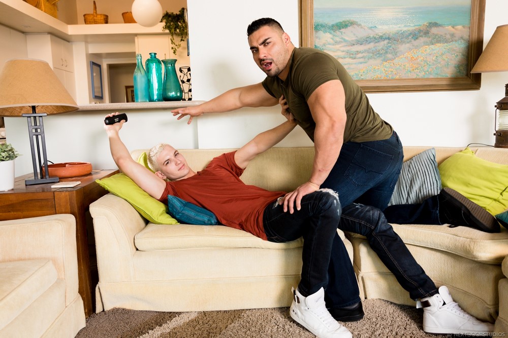 Derek shows no mercy on his roommate, giving him a hard pounding from behind as he fucks Jay all over the couch in every position, finally fucking the cum out of his roomie as he pulls out and soaks him with his load. As Derek slowly works the tip back in, he tells Jay the tv is all his, but Jay seems to have found something better to pass the time.