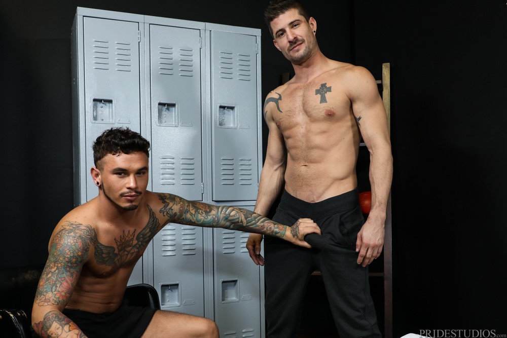 With the release of “Working Out Gets Me Horny“, the Pride Studios network brings us back to the infamous locker room. Seth Knight is sitting in the locker room after his workout as inked stud Sean Maygers walks in. Sean does not see Seth and goes to his locker and starts undressing.