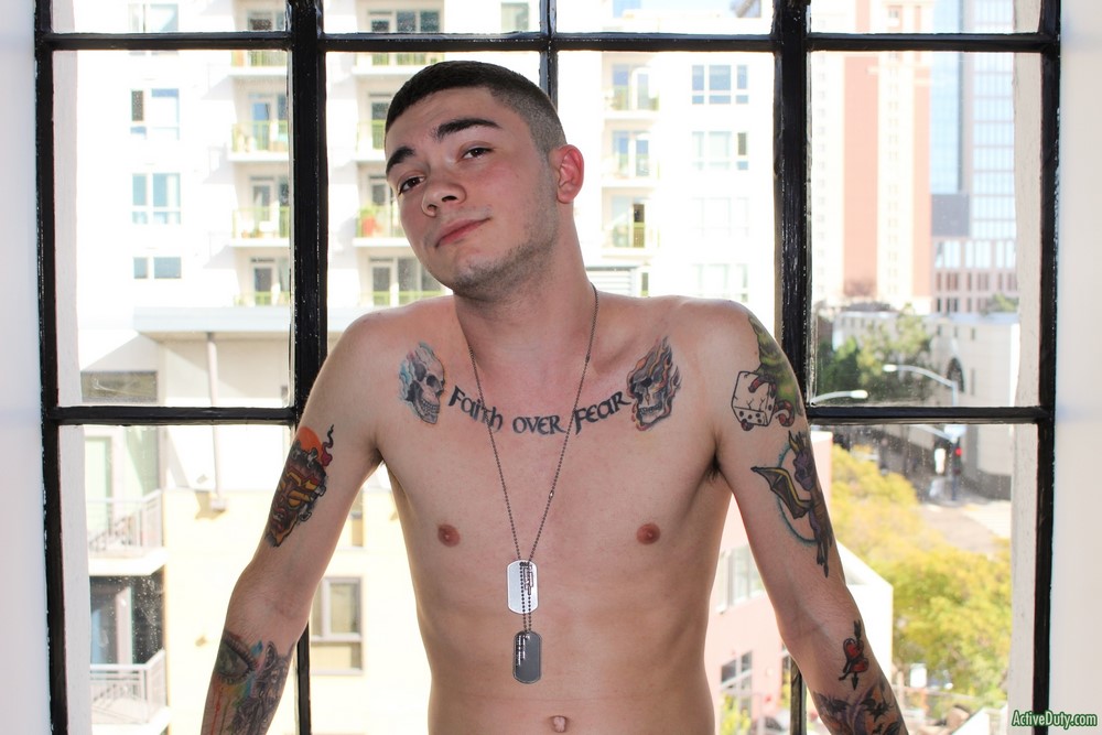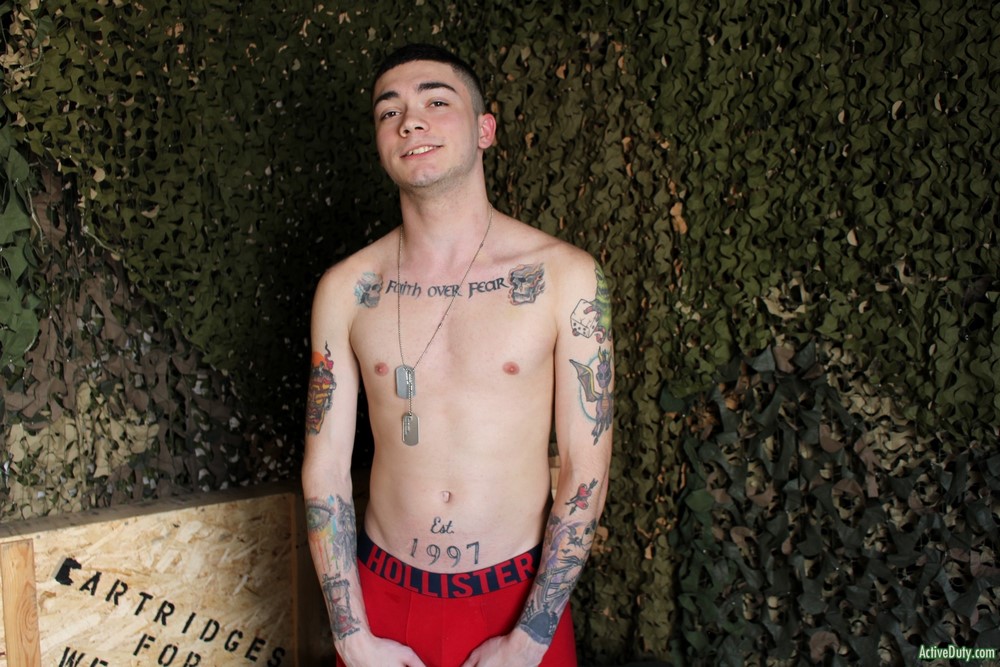 New Active Duty recruit Ashtin Bates may not look limber, but this boy is as limber as they come. He has smooth milky skin with some very sexy hair that isn’t too over bearing. His ink fits him perfectly and he loves to show off for the camera. He has some big low hanging balls that look ripe for the picking and a very hard dick that I’m sure the Active Duty vets would love to tackle.