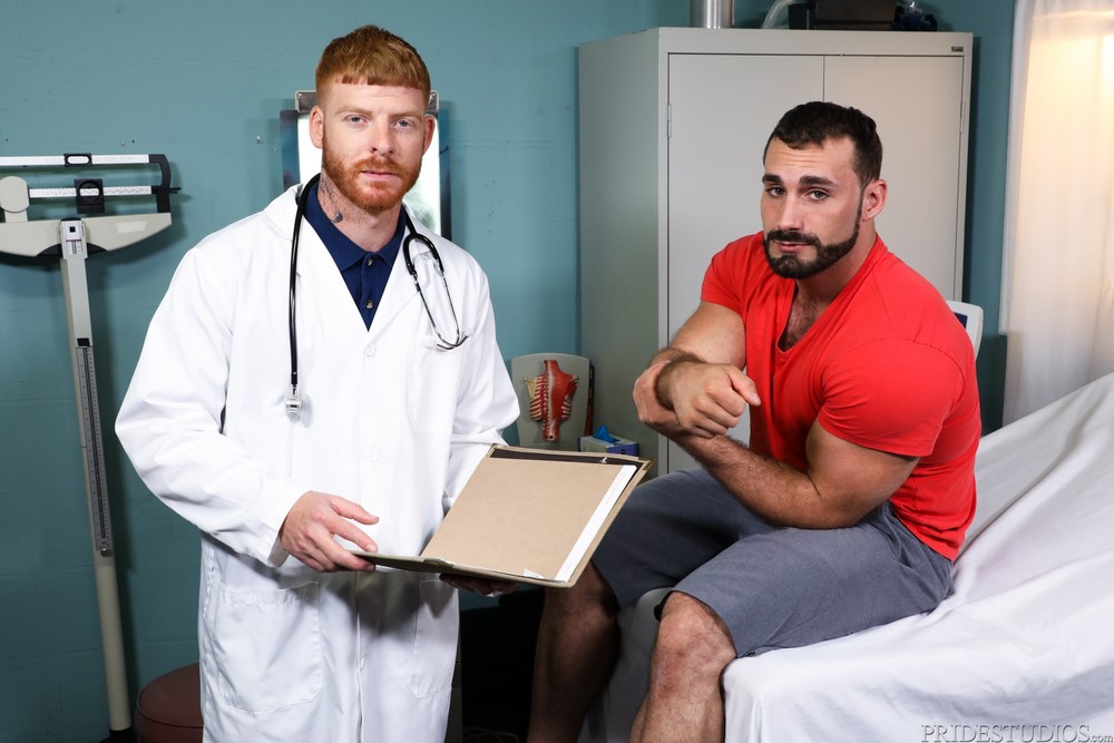 The latest release from the Pride Studios network is called “I Need to be Examined“. Hairy stud Jaxton Wheeler goes to see his hot ginger doctor Bennett Anthony and ends up probing his ass. Jaxton has come to Dr. Anthony because he has injured his hand again from punching a wall.