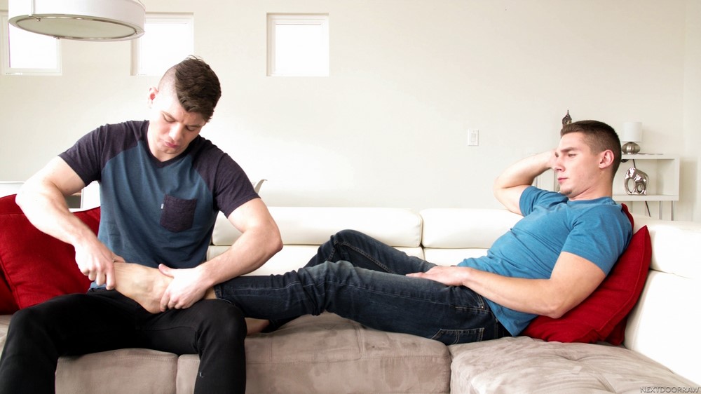 As Connor Halsted gives Spencer Laval a foot rub, both of them begin to entertain similar thoughts. Spencer wonders if Connor’s talents for touch apply to other parts of the body, and Connor wonders if it’s true what they say about guys with big feet. If Spencer’s half as big as Connor imagines, it will be worth the effort of making a pass. He reaches the bulge in Spencer’s pants and rubs his package gently. Spencer doesn’t jump back, which tells Connor everything he needs to know to go further. He tells Spencer to let him focus on the area that has the most tension, and Spencer decides Connor knows what he’s doing, so he consents. Connor immediately shows Spencer what a wise choice it was, as he kisses his way down to Spencer’s dick, pulling it out and downing it in one swallow. Spencer has never had his whole cock swallowed by any woman, much less had them go at it with the intensity that Connor sucks his cock. He gags on it like he needs it badly, so Spencer tells him to climb on top and give it a spin. Connor inches himself down on Spencer’s massive hard dick, finally making his way down to the base, before Spencer grabs him by the waist and begins to fuck him harder. Pounding his hole repeatedly, Spencer watches Connor’s ass bounce on his cock up and down, before deciding to flip him over onto his knees. Spencer bends him over and fucks his face into the side of the sofa, long dicking him from behind as Connor moans and begs for more. He’s ready to cum, so he flips over onto his back and tells Spencer to fuck him harder, as he strokes his nut all over his stomach. Spencer sees him cum and leans into him ever faster, pulling out and hovering over Connor’s face. He unloads a giant, sloppy facial that Connor happily swallows. Big feet, big dick, big load.