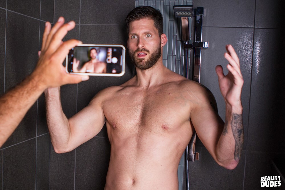 Muscular Darcy thought he could sneak up on tattooed Logan in the shower and record the tall stud. He didn’t anticipate getting caught by big dick Logan, who turned the tables on him and took over the recording. He made the bearded buff drop to his knees in the shower and suck his uncut cock off before letting go on his ass and pounding into his anal passage.