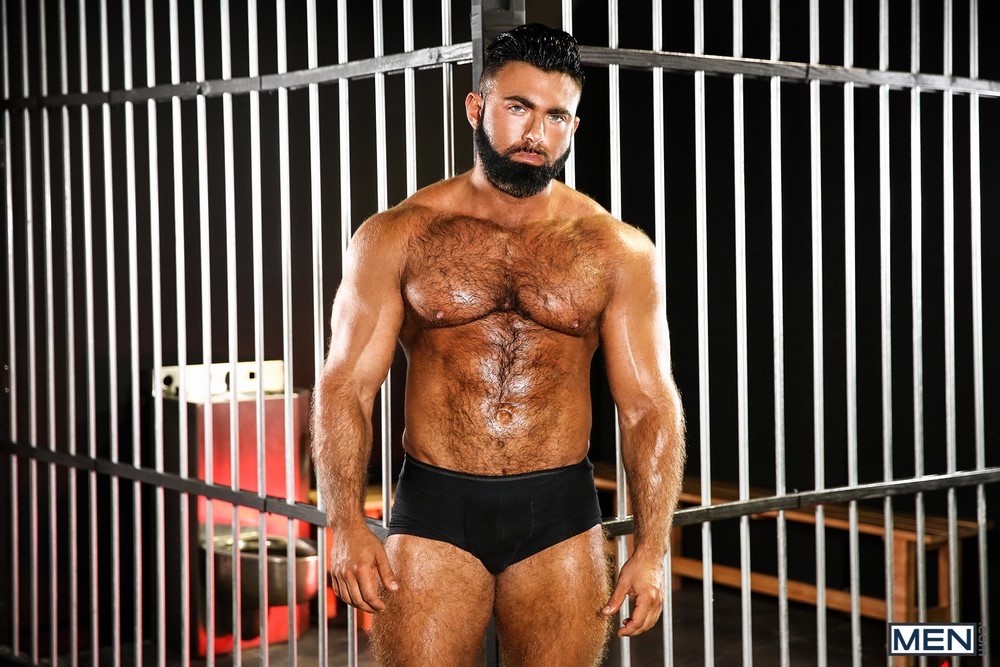 The coast guards are finally celebrating their latest victory after having caught Brazilian dealer, Diego Sans. Muscular Jeremy Spreadums and beefy Steven Roman pay the dark-haired, toned inmate a visit and things heat up as they break a few laws and partake in a hot prison threesome.