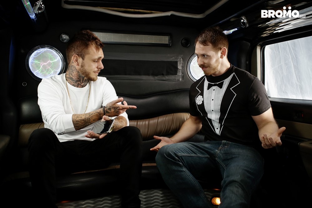 The latest release from bareback studio Bromo is called “Stretch Me Bro“. Athletic, tattooed Brian Michaels has been waiting on muscular Spencer Whitman to arrive for hours now so they could ride together to a formal event.