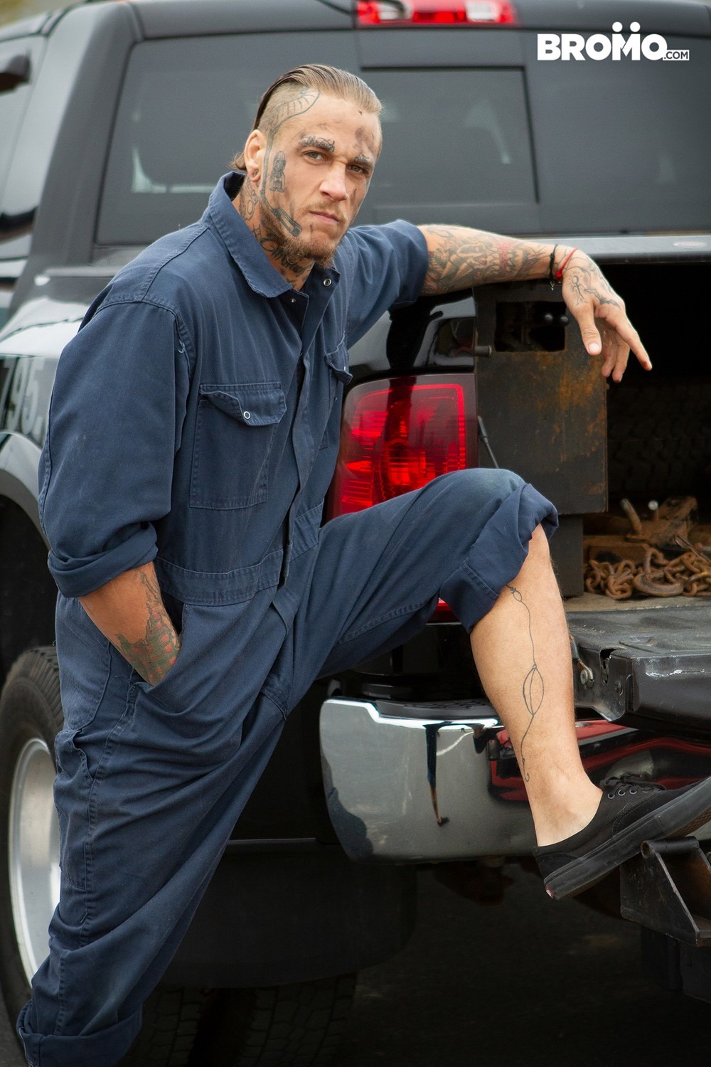 Shawn Assmore is enjoying jerking off in his car until raunchy mechanic Bo Sinn pulls up next to him. Caught off guard, Shawn quickly locks his doors, but Bo won’t leave him alone. Bo tows Shawn’s car back to his garage where he can keep him locked up for his personal pleasure. Bo lures Shawn out of the car with his fat cock and pounds Shawn’s tight asshole as payment for the tow.