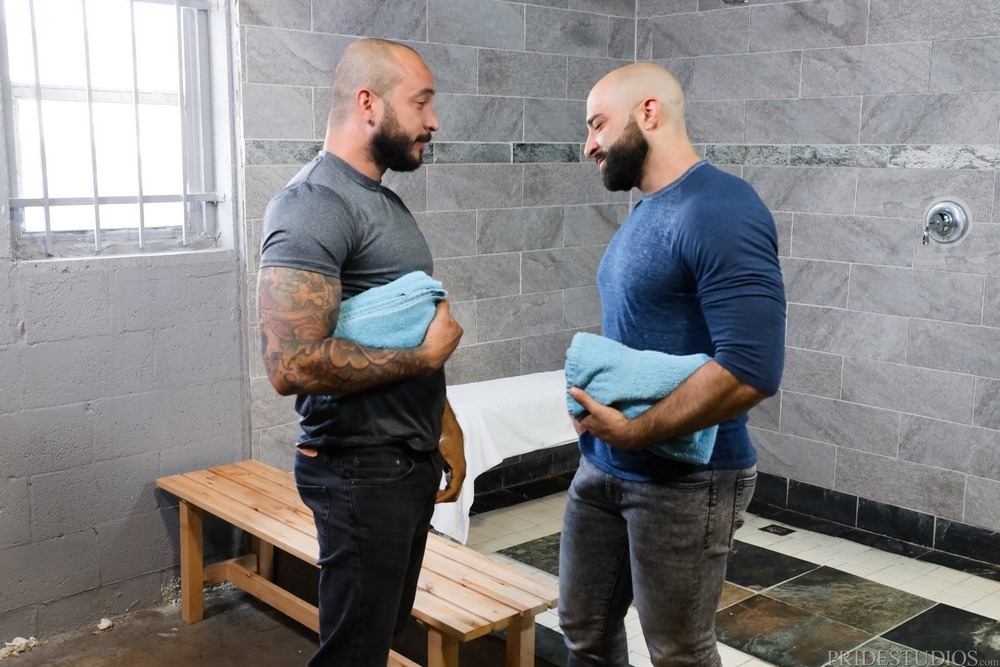 Julian Torres and Atlas Grant have come to the public shower to fool around with each other and they are very excited about it. They undress and both are hard as a rock. Julian starts sucking Atlas deep down his throat and then they move into the shower where they take turns sucking each other under the water. Atlas rims Julian’s ass deep with his tongue. Then Julian rims Atlas the same way. Atlas then bends Julian over and fucks him from behind. He then puts Julian on his back and fucks him deep until both shoot their loads all over their hairy bodies.