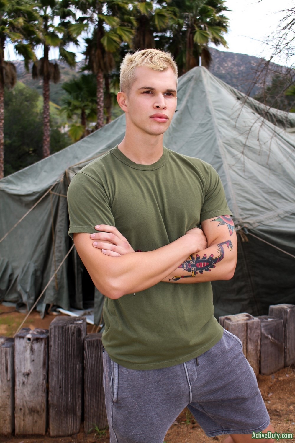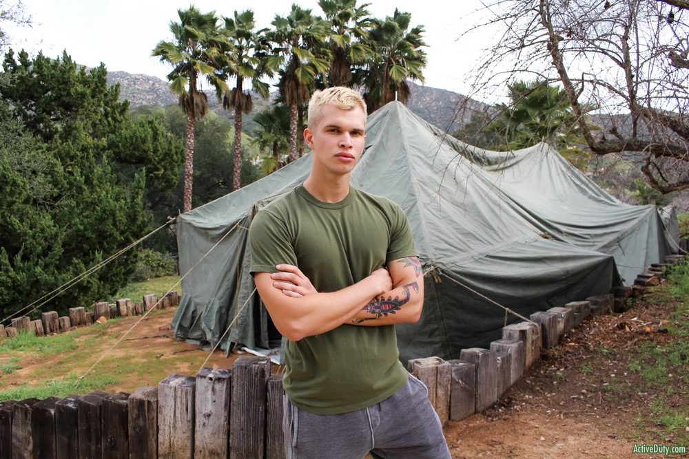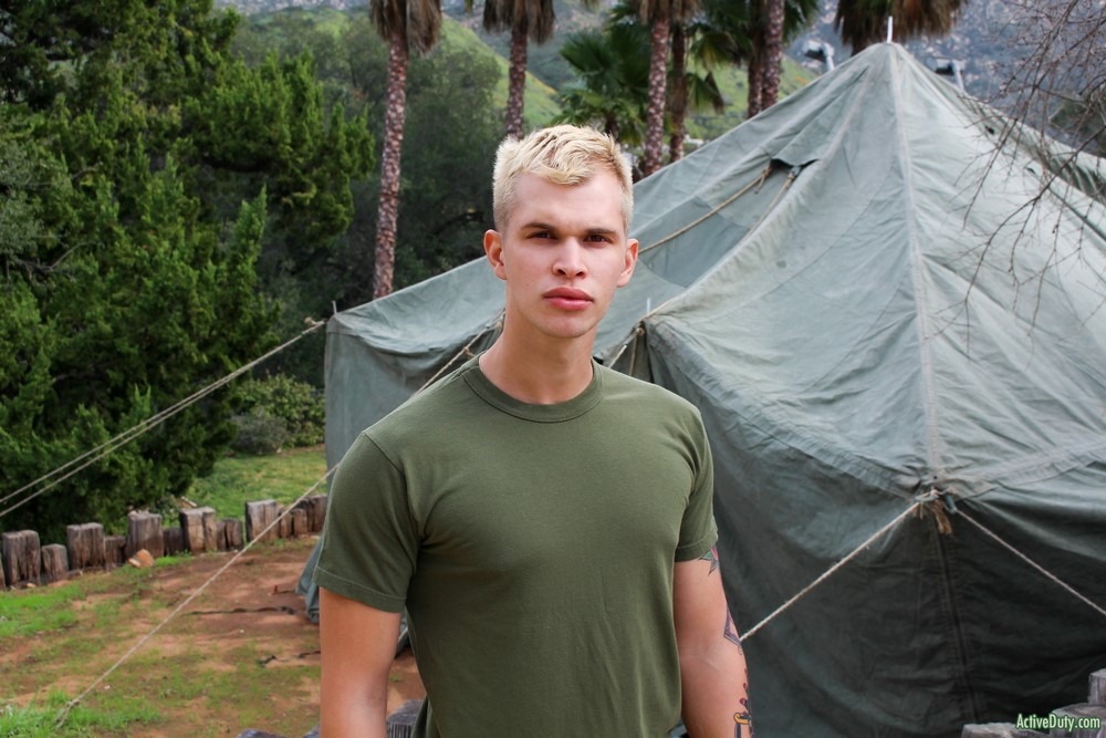 This handsome soldier – called Eric Tanner – strokes his juicy cock in today’s solo scene from Active Duty. Newbie Eric Tanner is ready to rock and roll as he drops his pants and stands up and begins jerking off. He masturbates with a quickness tugging every inch of his big dick. He doesn’t slow down one bit as he holds his balls back while his other hand works his shaft.