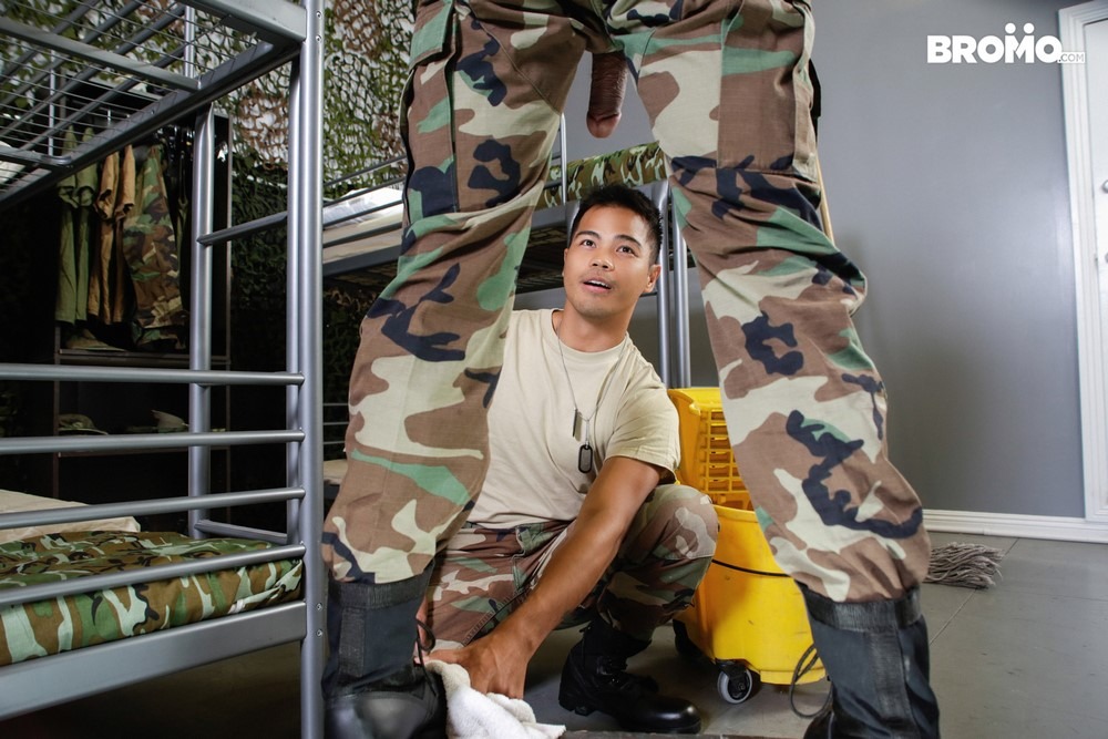 Rene sucks John’s hard cock as he stares up at John’s moaning face. Under Cesar’s tough exterior though, he’s a hungry bottom bitch who can’t wait for John to pound his hole all over the barracks. John fucks Cesar until he’s about to blow then lets the strict officer squeeze every drop of cum out of his cock and all over his eager face.