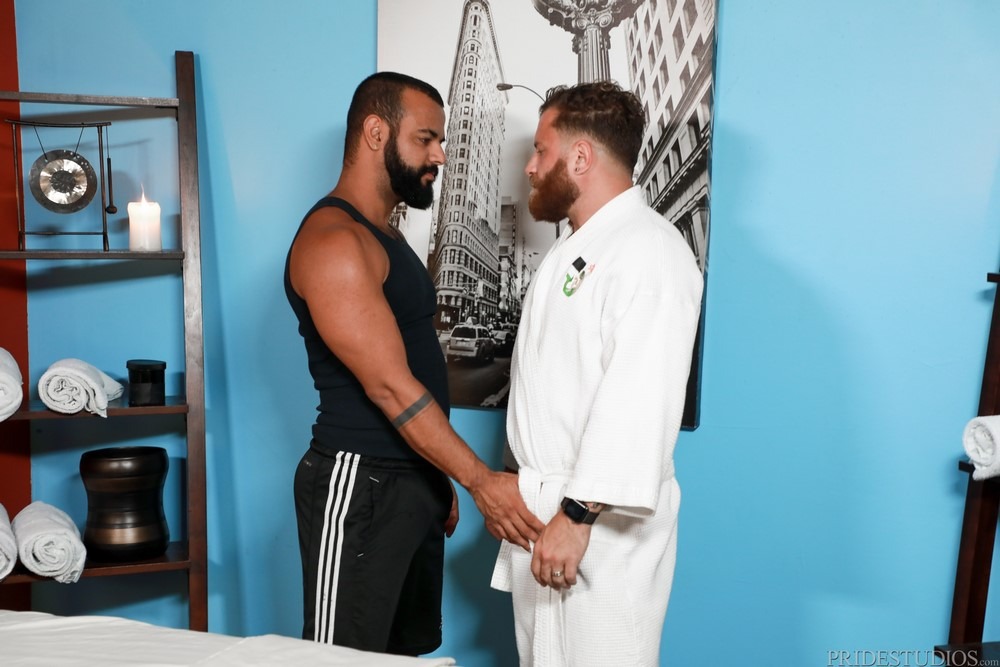 This Pride Studios release – called “Beef Massage” – brings together two bearded and masculine men! Riley Mitchel has come to Tony Orion for a nice deep massage. Once on the table, Tony cannot help but compliment how good Riley looks and begins paying special attention to his beefy ass.