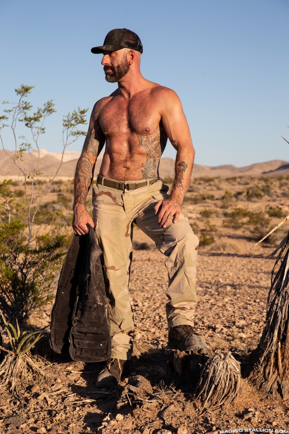The fifth scene from “Blood Moon: Timberwolves 2” brings together two hot masculine men; Drew Sebastian and Drake Masters. Drake is forced to face his actions, in exile in the desert. He thinks he’s alone, but the wind carries his scent to a nearby campsite where Drew Sebastian is polishing his big gun. Drew finds Drake Masters and takes him back to his tent, where he educates the pup in more ways than one.
