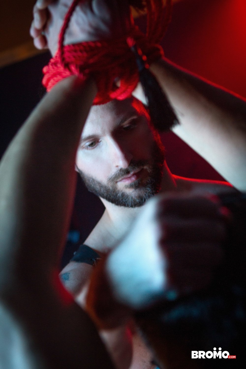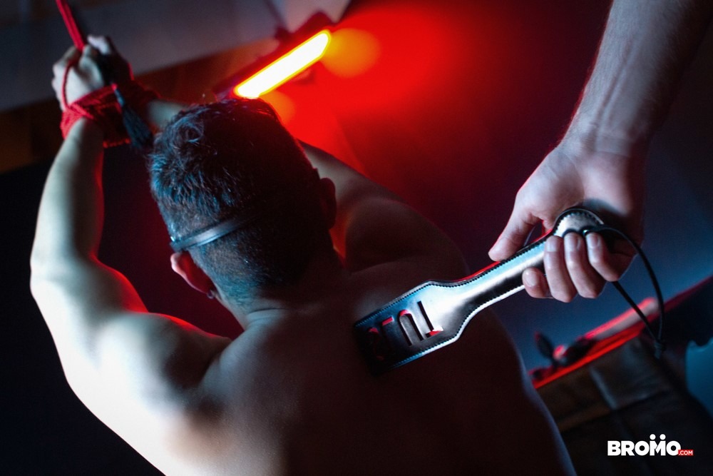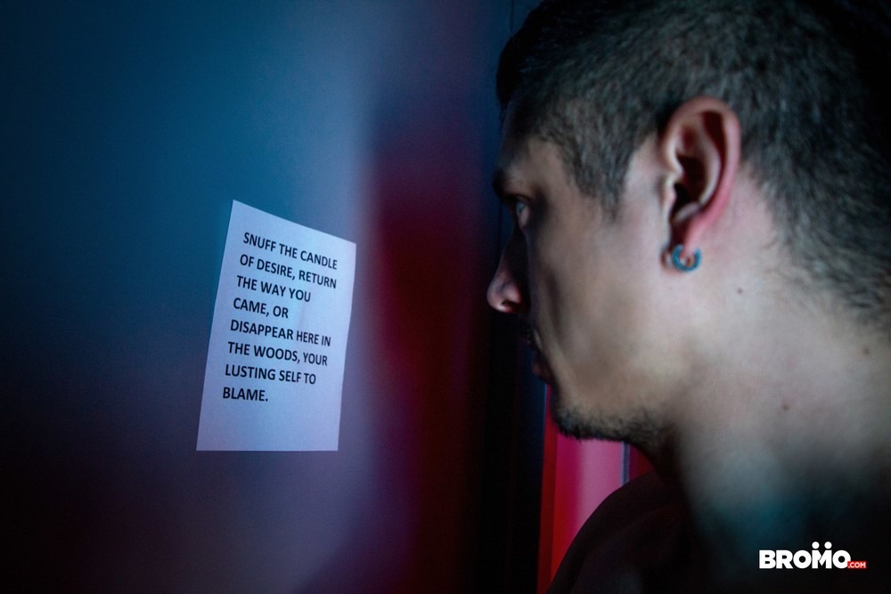 This is the second scene from the “Woods” mini-series by Bromo. The Woods is a place where paths diverge, and Rocky Vallarta isn’t finished following where they lead. After trying out the hardest path, Rocky Vallarta selects the door that bears the sign of the path well traveled; inside waits Logan Styles in a harness, with his lovingly laid out bondage tools beside him.