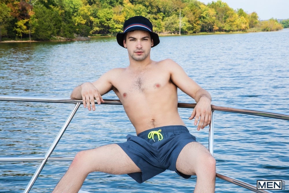 This is the first scene from a new Men.com series, called “Captain Rapid“. Johnny Rapid is chilling on his boat at the marina when he spots muscular stud, Trevor Laster. Trevor doesn’t have a boat of his own, so Johnny invites him aboard for a little cruise. Trevor Laster enjoys the boat ride so much, he gets a big boner, and Johnny Rapid wants to suck it!