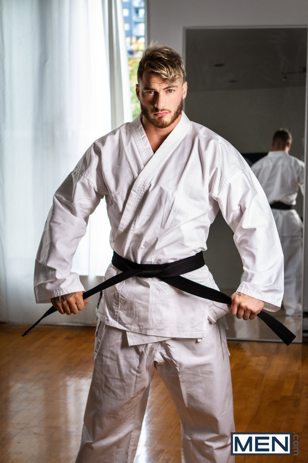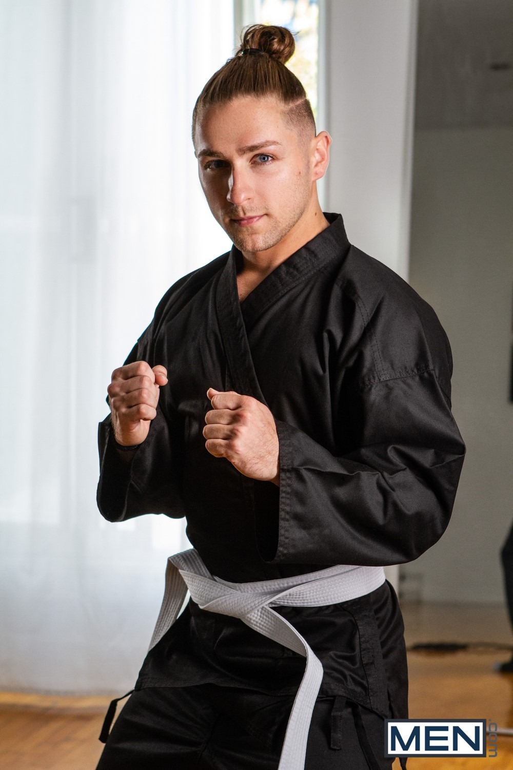 Calvin Banks wants to help, and William Seed gives him an important job: take care of his boner! Calvin gets right to work with a sloppy blowjob, then takes a doggy-style pounding before using the dojo’s sling to get into ballerina position. Sensei William fucks Calvin in suspended missionary and makes him cum, then rewards his dedicated student with a huge facial!