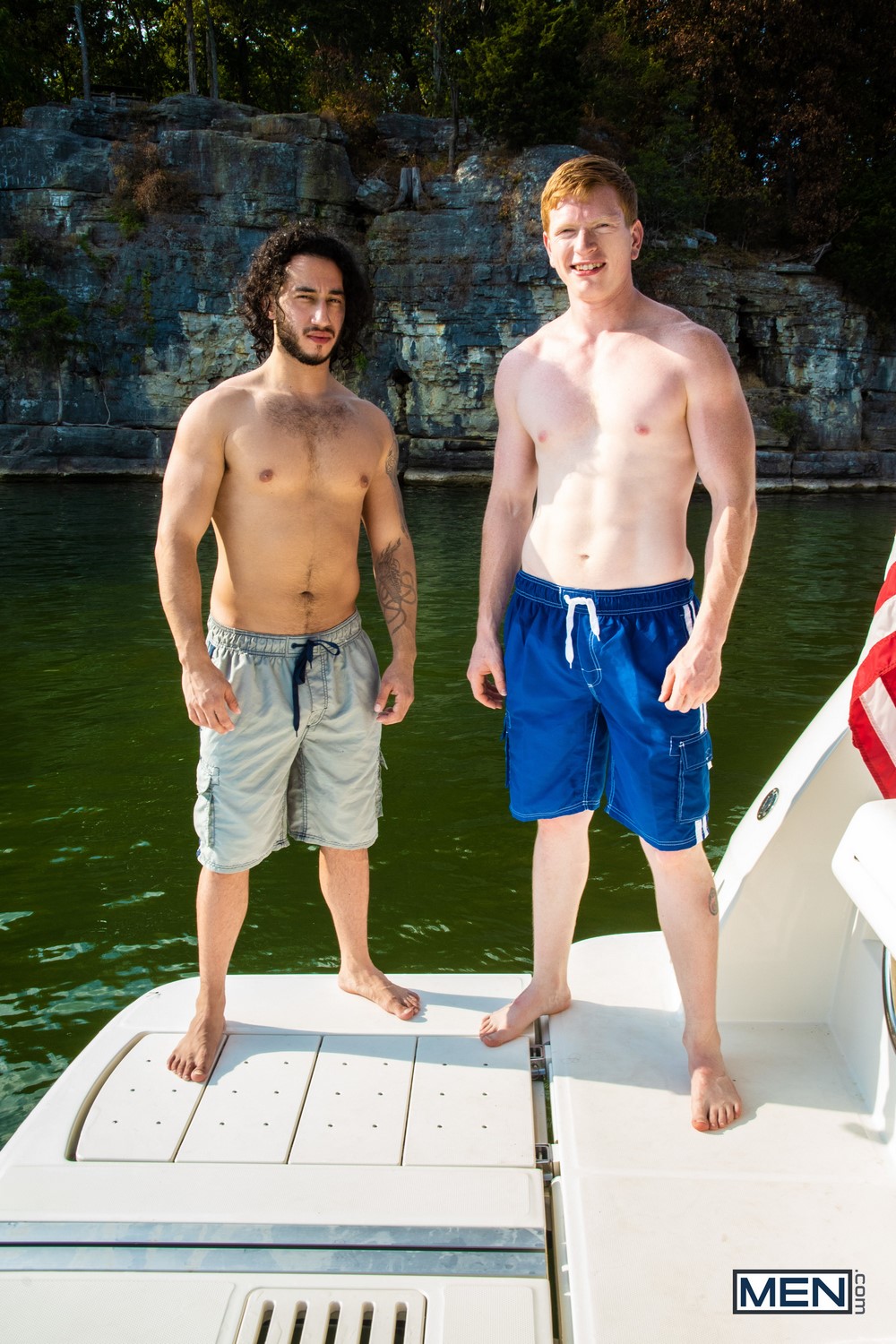 The 3rd scene from the Men.com series “Captain Rapid” is a bareback flip-fuck video starring Xavier Cox and Kyle Connors. When Johnny Rapid spots two hot guys sitting on the cliffs overlooking where his boat is anchored, he swims over and convinces them to come aboard. But before Johnny can let ginger Kyle Connors and bohemian Xavier Cox into the cabin, they have to obey the maritime law and fuck!