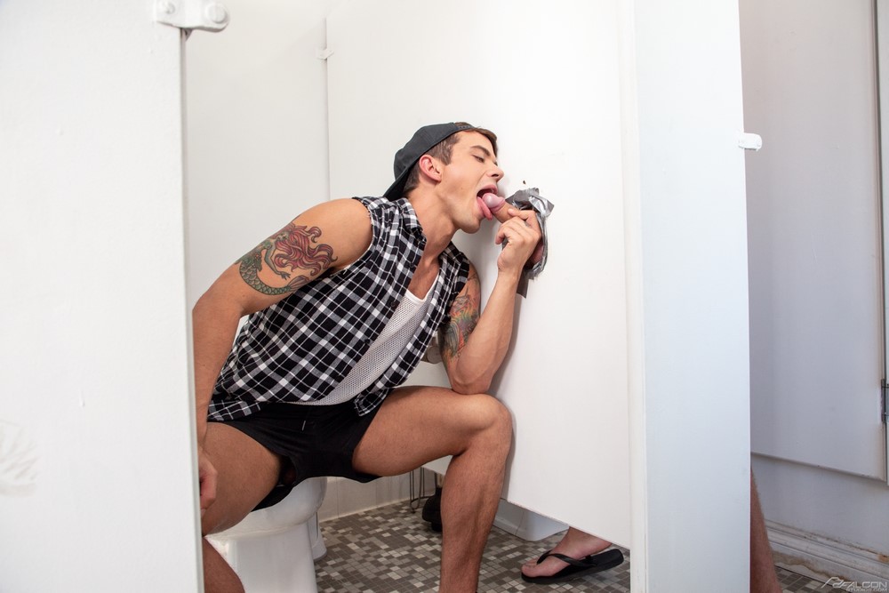 Josh Moore uses the bathroom where cute cocksucker Dakota Payne is cruising the urinals and waving his big boner. Josh spots Dakota and scurries back out to the gas pump. Dan Saxon takes his turn, and his time, once he discovers Dakota and a glory hole stall inside.