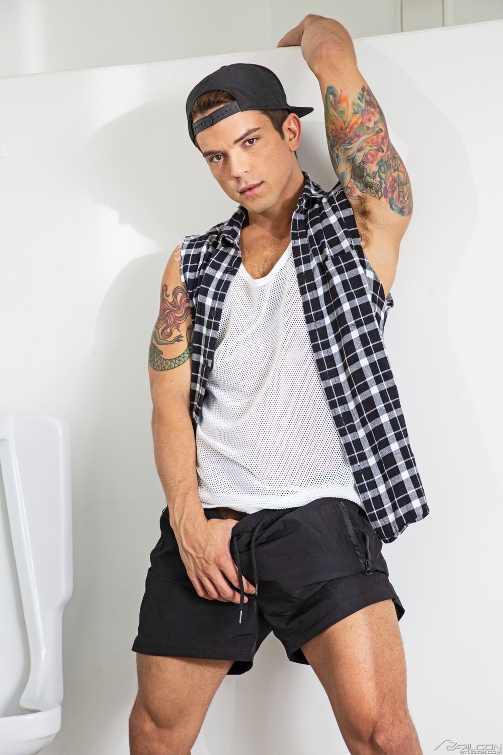 This is the third scene from the new Falcon Studios movie “Califuckinfornia“, in which Dakota Payne sucks Dan Saxon off in a public bathroom. Road trip buddies Josh Moore and Dan Saxon have wildly different opinions about casual sex, as proven when they pull into a gas station to fill up the tank on their van.