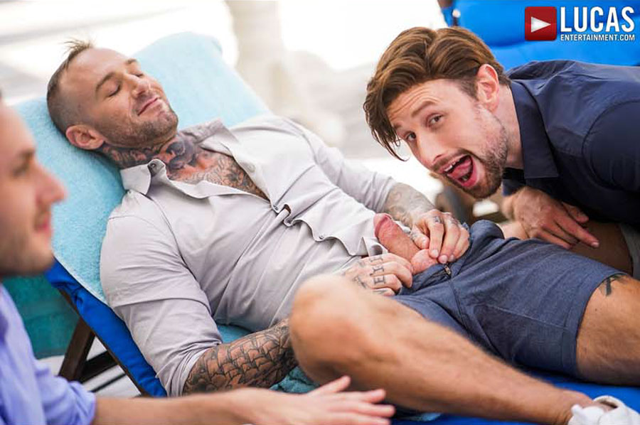 Gay porn stars Edison Fuller and Drew Dixon service inked stud Dylan James in the second scene from the “Tearing Up Some Ass” movie. Dylan James still remains one of the top-tier Lucas Entertainment men, and for very good reason; his masculine good looks, his inked muscular body, and (most importantly) his huge cock!