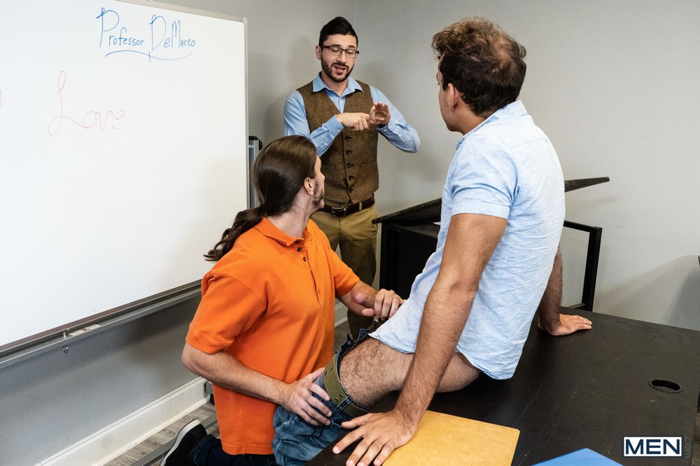 This bareback gay porn video is called “A Lesson In Love” and marks the Men.com debut for Tim Hanes. Slackers Damien Kyle and Tim Hanes don’t find the ‘Lessons of Love’ class from Professor Scott Demarco any more interesting the second time around. The two guys are interested in each other though.