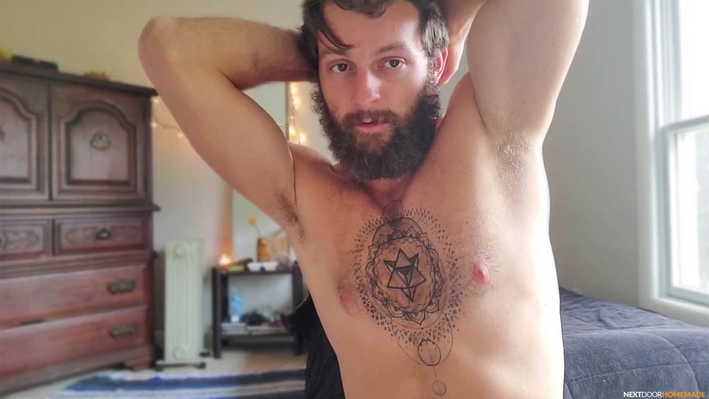 Bearded stud Andre Grey can’t keep his hands off of himself. Watch him play with his hairy ass hole and stroke his big uncut cock in this exclusive Next Door homemade scene.