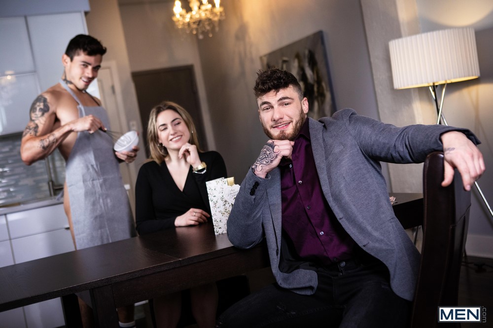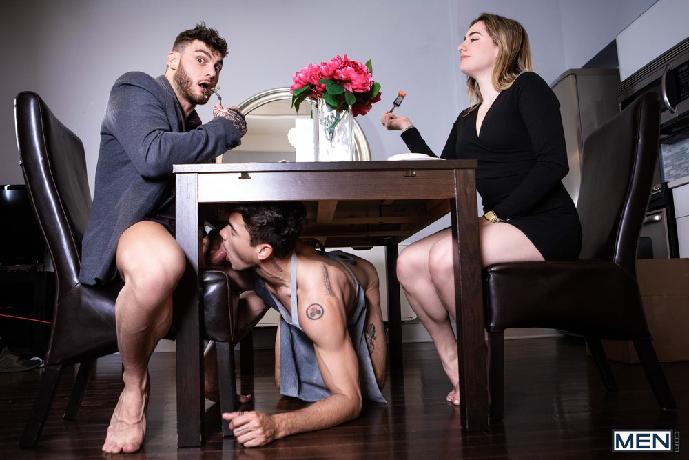 Chef Ashton then sucks William’s cock under the table. William can’t pose for a selfie when his cock is getting devoured like a kielbasa, so his girlfriend stalks off to sulk. The hungry top pounds Ashton on the table till they both cover the chef in special sauce.