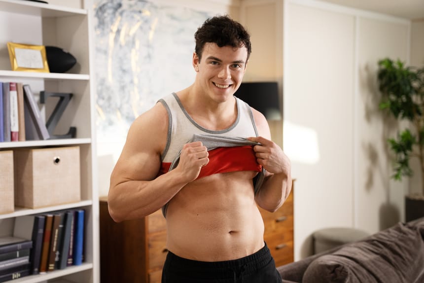 Clark gets so horny touching his bulge on the couch, he rips open his gray briefs and fingers his hole. Blond hunk Brogan peeks in and the guys share some intense eye contact.
