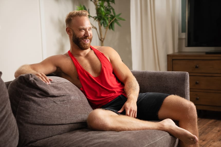 Clark gets so horny touching his bulge on the couch, he rips open his gray briefs and fingers his hole. Blond hunk Brogan peeks in and the guys share some intense eye contact.