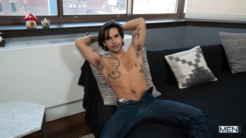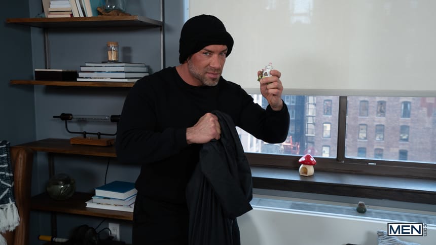 The latest Men.com release – called “Sitting On The Burglar” – brings Bruce Beckham and Ty Mitchell together. When Bruce is about to get caught red-handed burgling Ty’s place, he lies down on the black couch and tries to blend in!