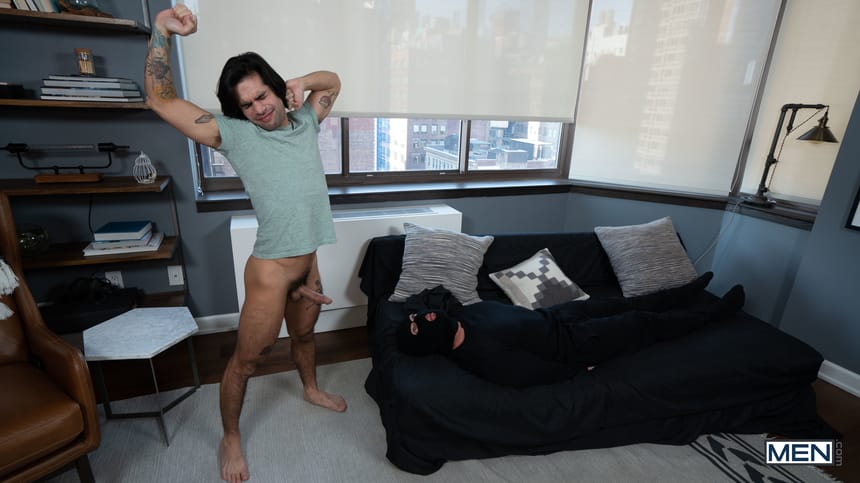 It works, as bleary-eyed Ty Mitchell walks out of the bedroom… and sits his bare ass on Bruce’s ski-masked face. But Ty quickly notices something’s different when his couch starts moaning and jumps up to find his trinkets in the burglar’s bag.