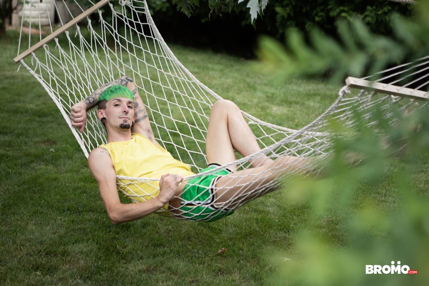 Charly Willinsky takes Bo Sinn’s huge cock in the latest Bromo release, called “Wreaking Hammock“. Bo sneaks through the hedge to spy on Charly Willinsky as he’s relaxing in his hammock.